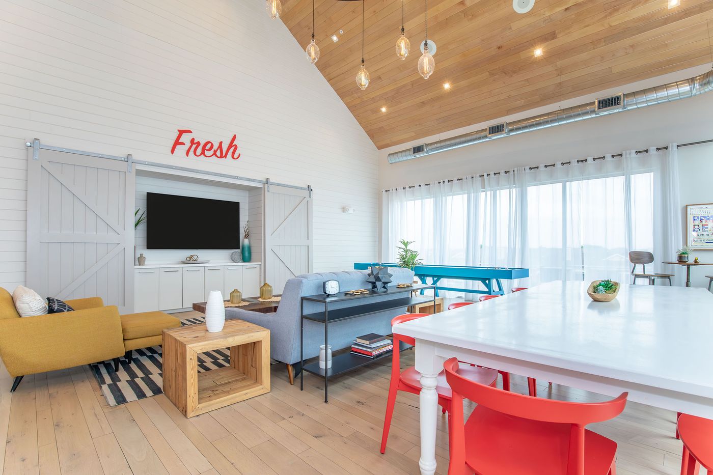 Immerse yourself in the extraordinary, high-end amenities offered at Farmhouse Apartments in Austin, TX. Every aspect is tailored for your enjoyment, from meticulously designed interiors to an exceptional pet-friendly environment. Stay active and fit, unwind on our full-scale shuffleboard court, or create cherished memories with your beloved pets at the dedicated pet park, grooming station, or yappy hours.